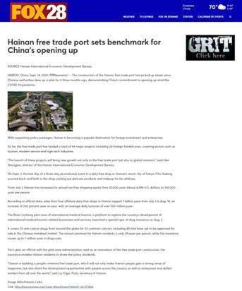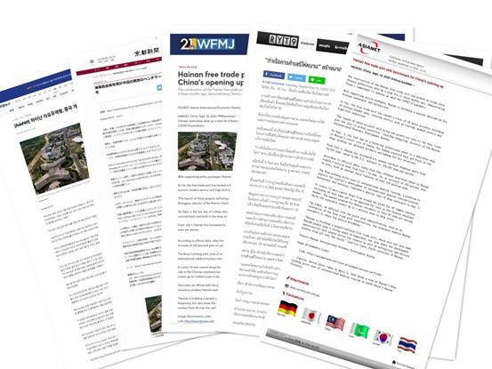 9月14日,全球通讯社联盟刊文《Hainan free trade port sets benchmark for China's opening up》(海南自由贸易港为中国开放树立标杆),聚焦《总体方案》发布100天后海南在各个行业、领域发生的变化。文章在亚太、美洲、欧洲等地区以英语、德语、日语、韩语、马来语、乌尔都语、泰语等七种语言播发,吸引美国福克斯有线电视网(FOX)、美国哥伦比亚广播公司(CBS)、美国广播公司(ABC)、德意志新闻社子公司、日本共同社、《朝日新闻》、韩联社、马新社、巴基斯坦国际通讯社等近280家主流媒体、门户网站及重点资讯网站广泛转载落地,总访问量超过1.2亿人次。